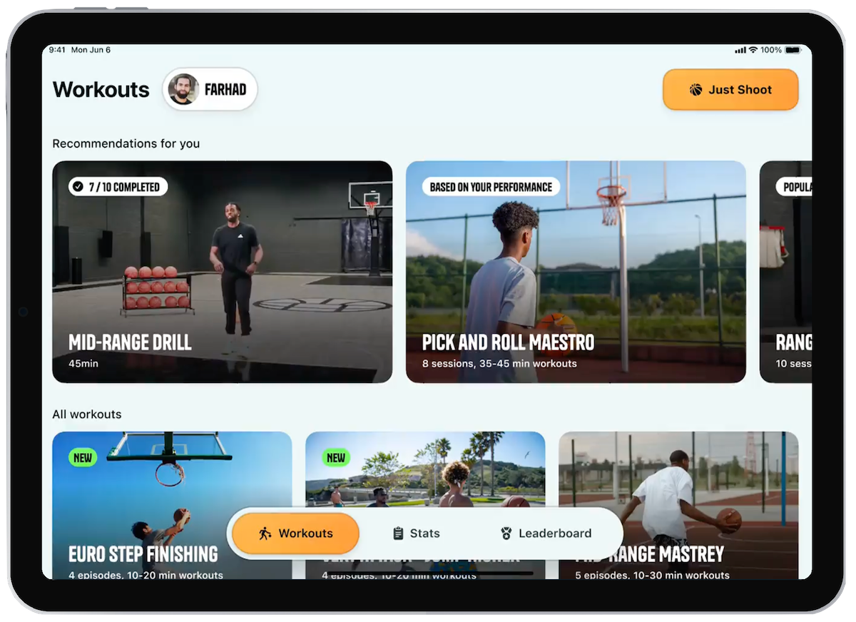 Don't just shoot, train. On-demand workouts with world class trainers. Select any workout and follow along. Workouts improve your game and keep your body primed for hooping.